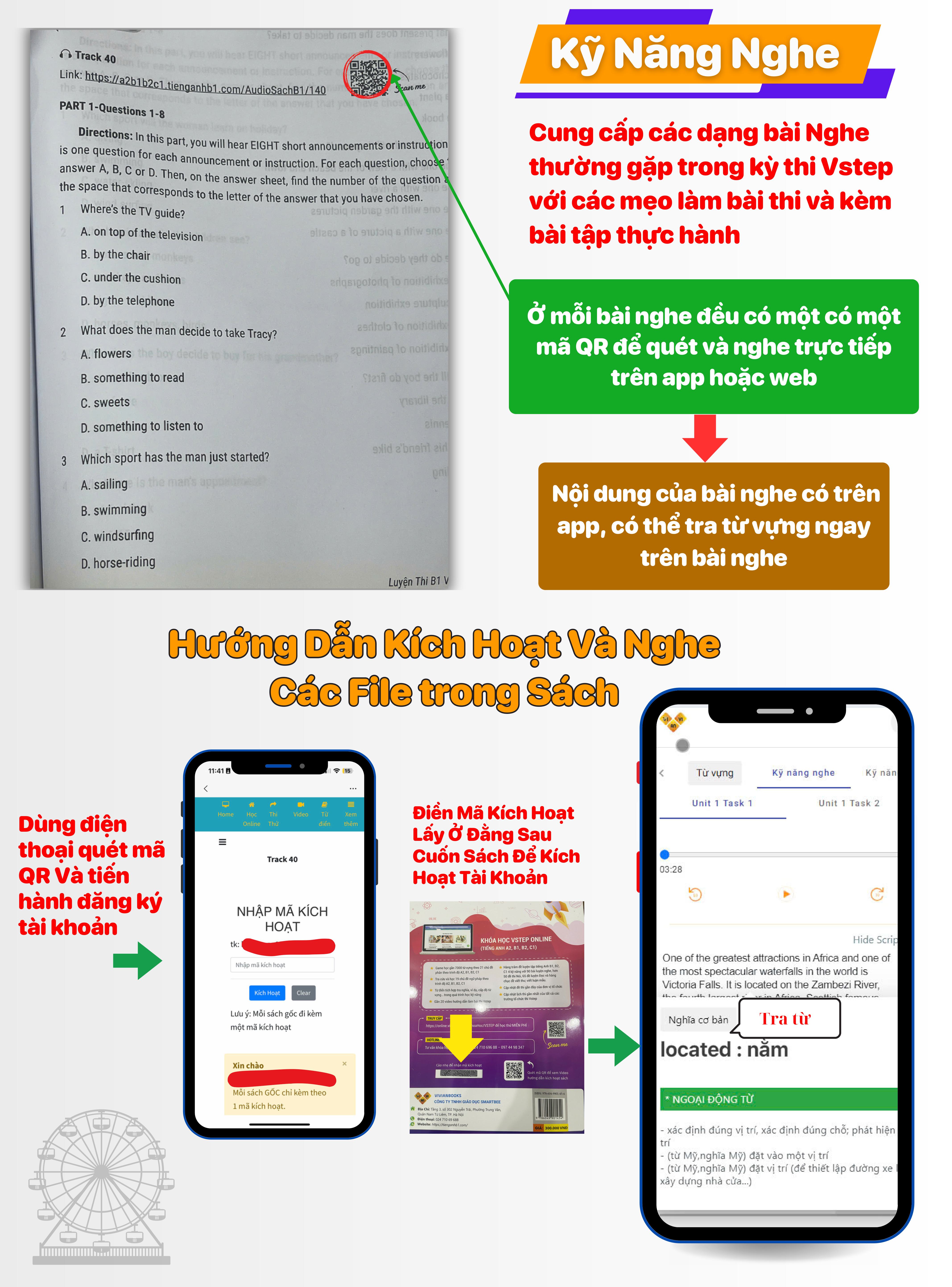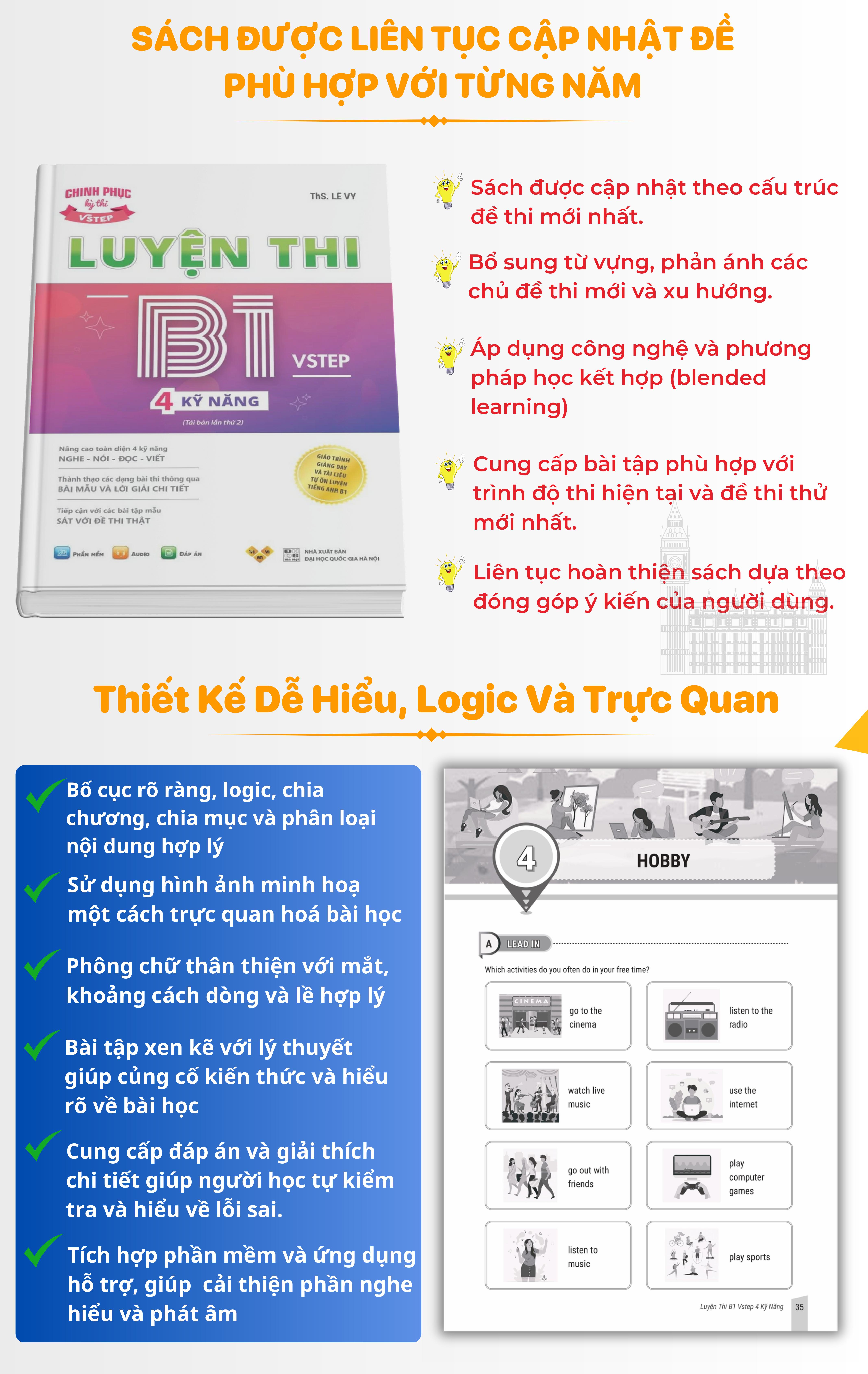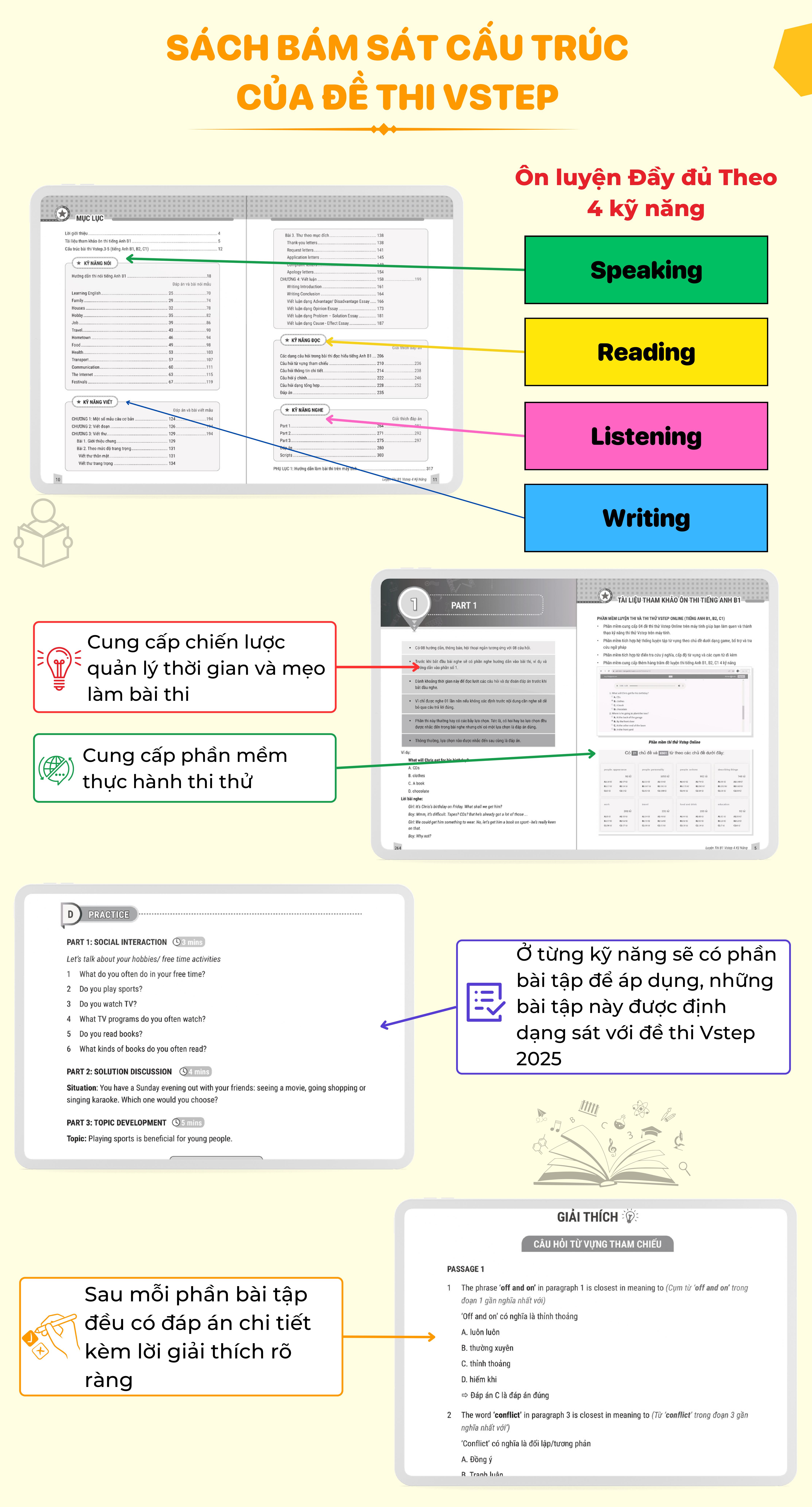 Tài liệu luyện thi VSTEP theo chuẩn Khung NLNN Việt Nam với phương pháp hiện đại, bao gồm 4 kỹ năng Nghe - Nói - Đọc - Viết.