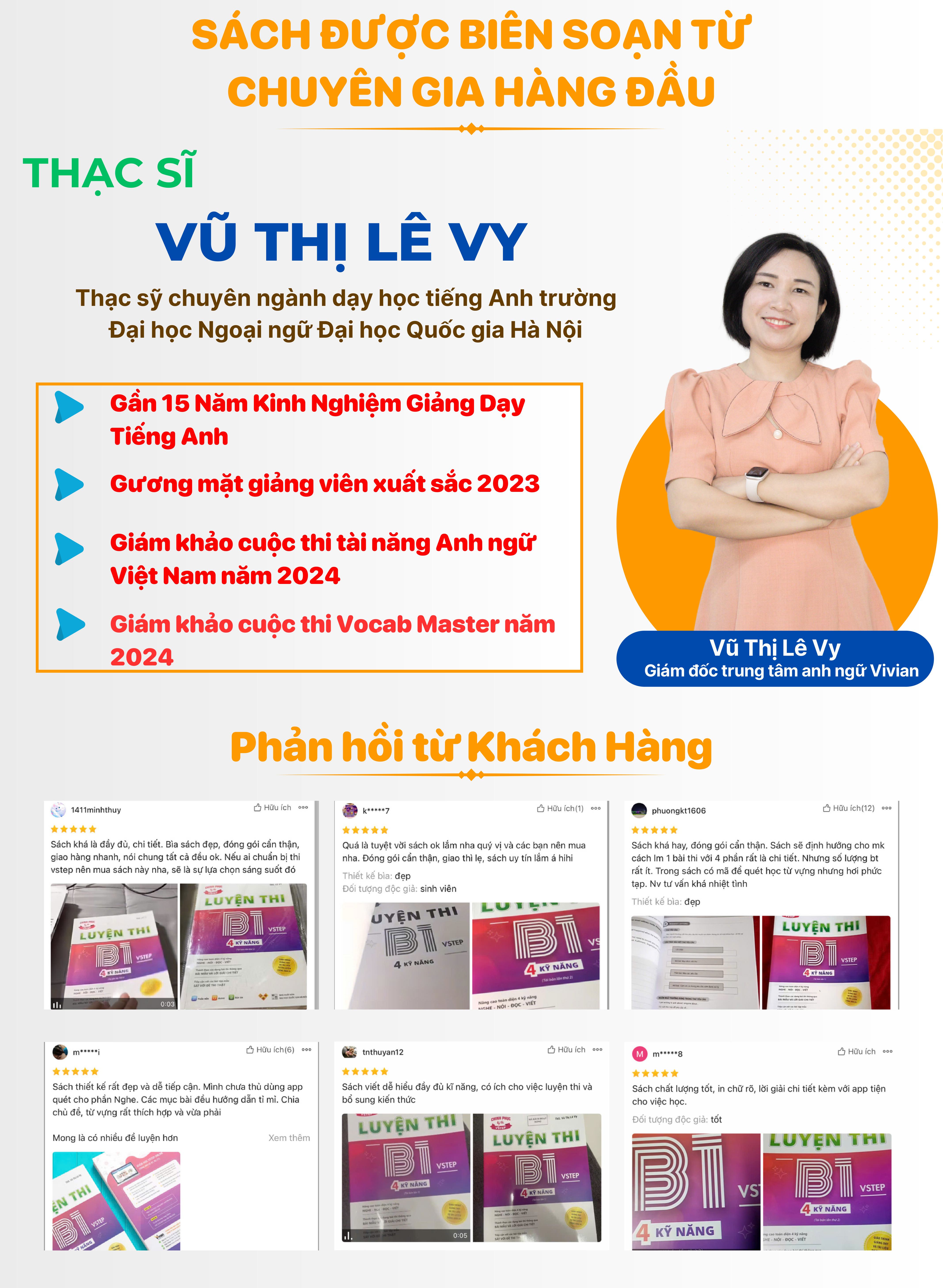 Sách Luyện thi B1 Vstep 4 kỹ năng do đội ngũ giảng viên Trung tâm Anh ngữ VIVIAN – Trung tâm luyện thi chứng chỉ tiếng Anh A2, B1, B2, C1 trực tiếp và trực tuyến biên soạn và phát hành, do Nhà xuất bản Đại học Quốc gia Hà Nội kiểm duyệt xuất bản. Sách xuất bản lần đầu vào tháng 3 năm 2021 và tái bản 1 năm ngay sau đó.