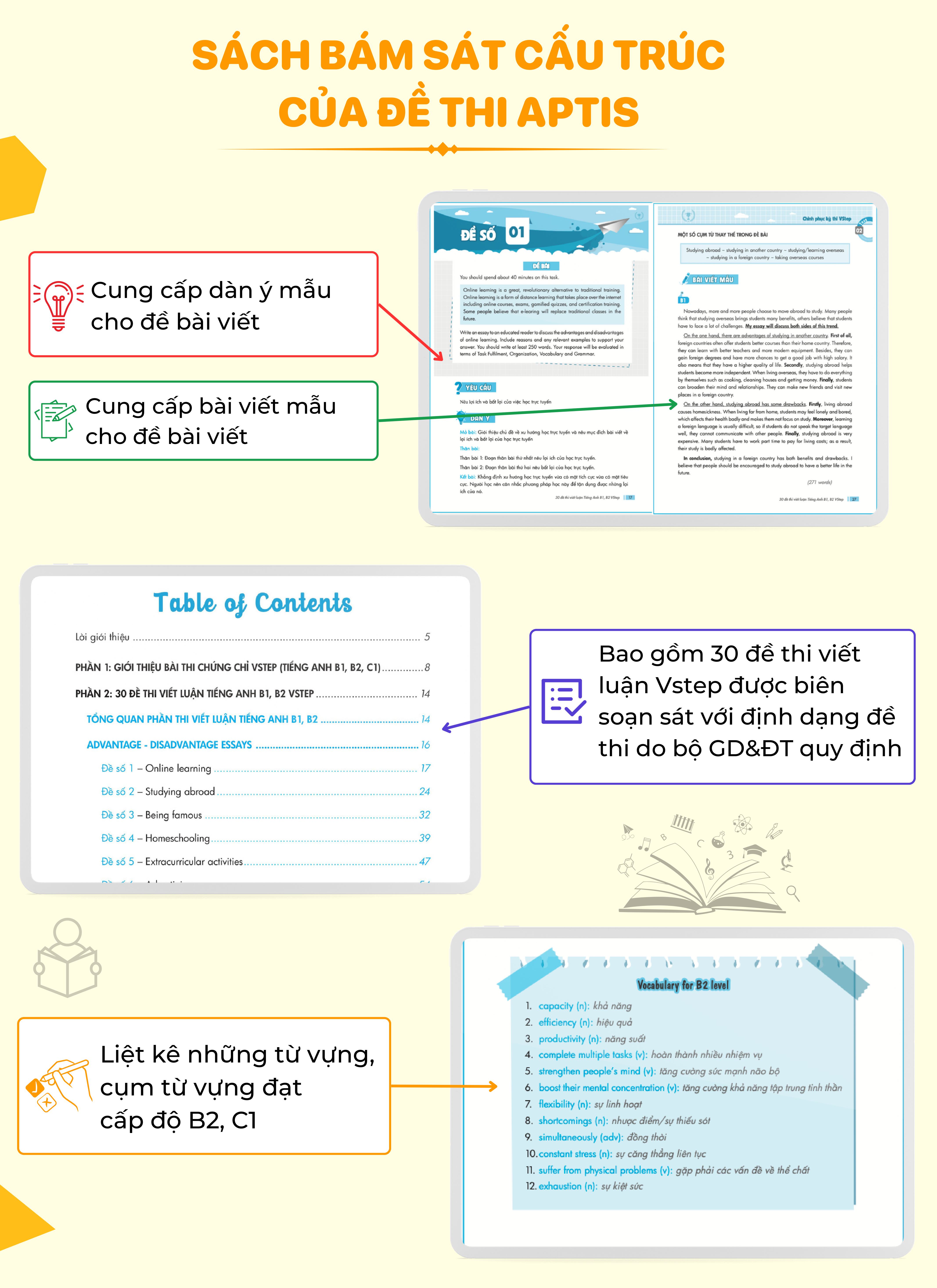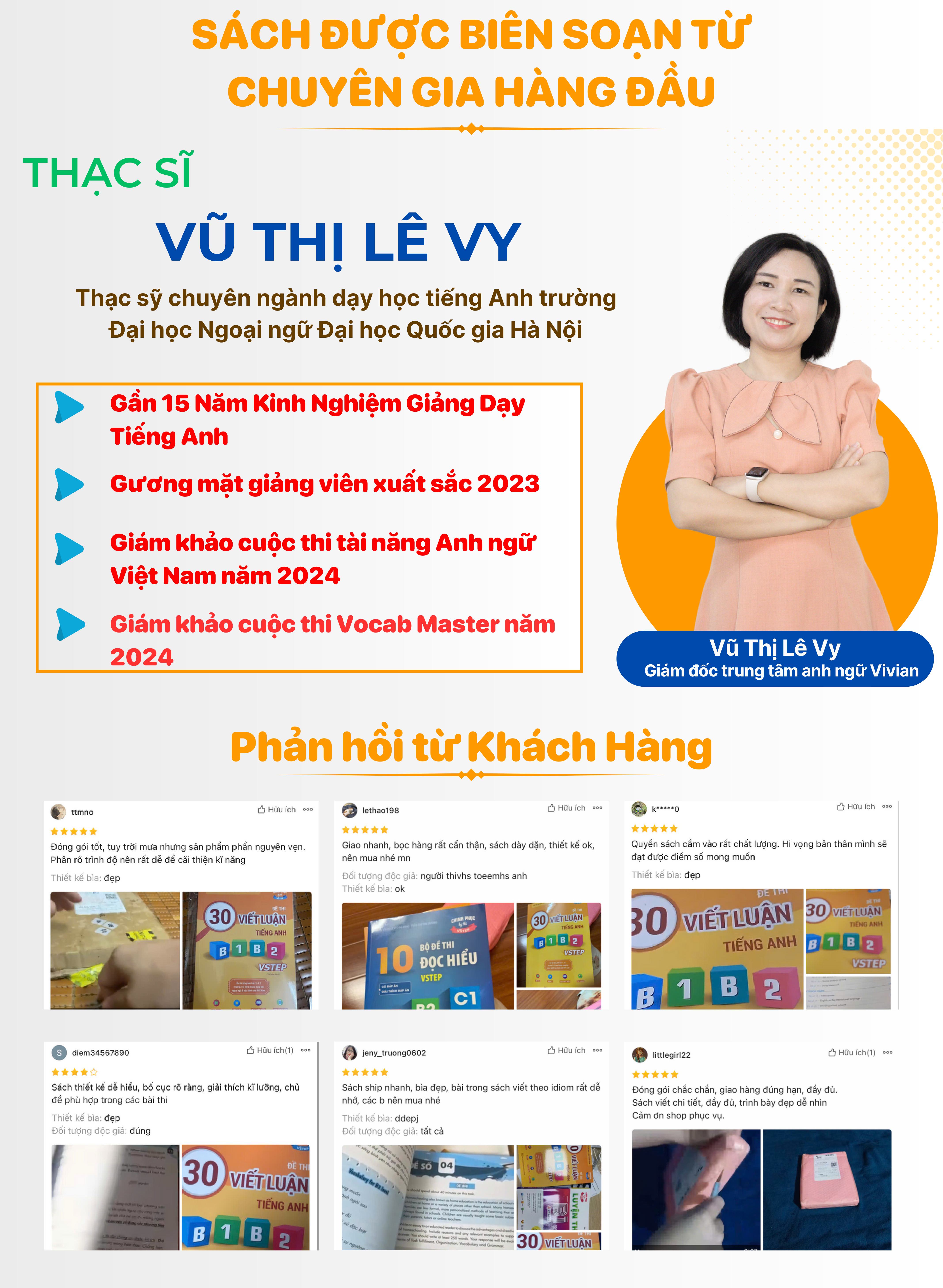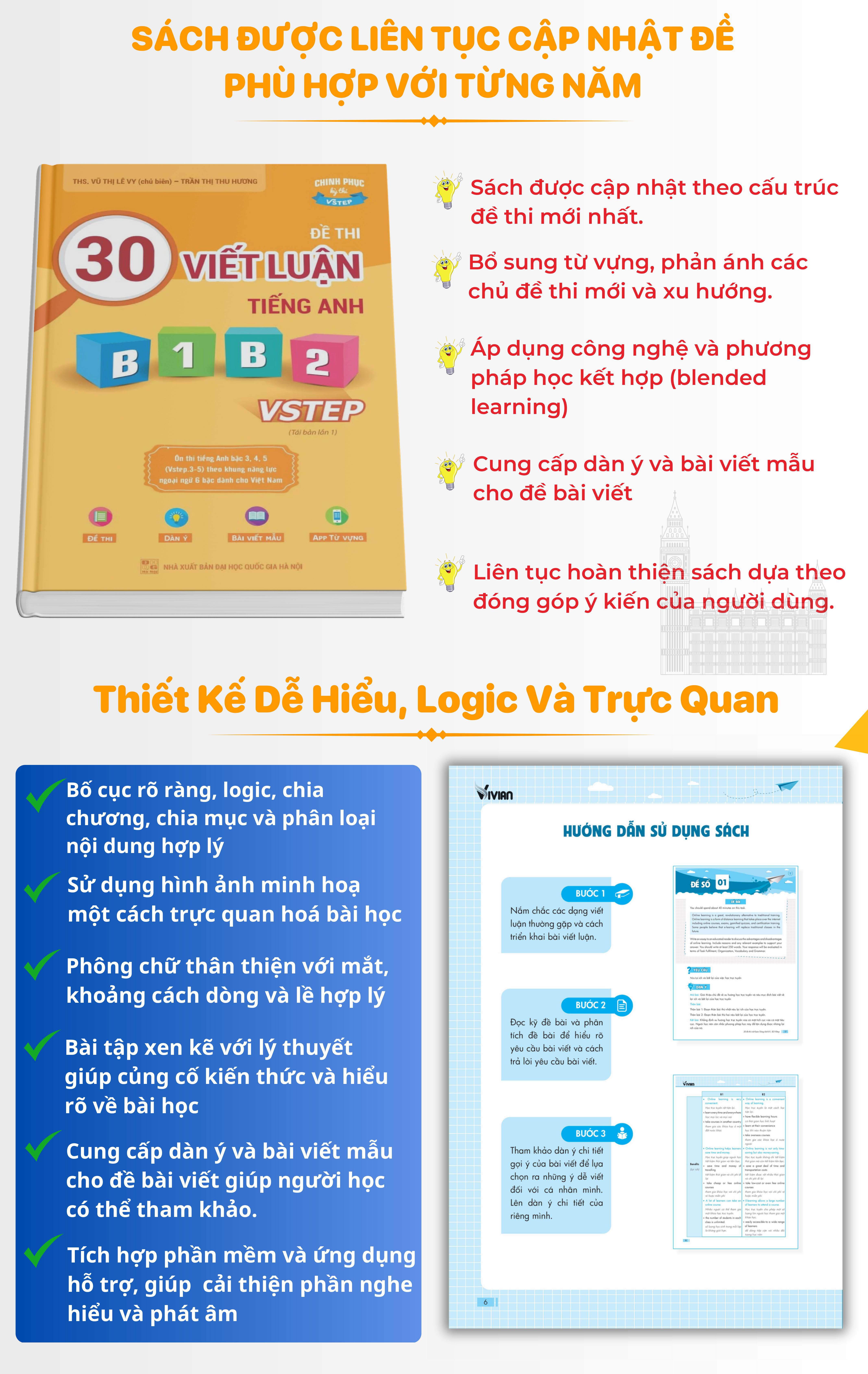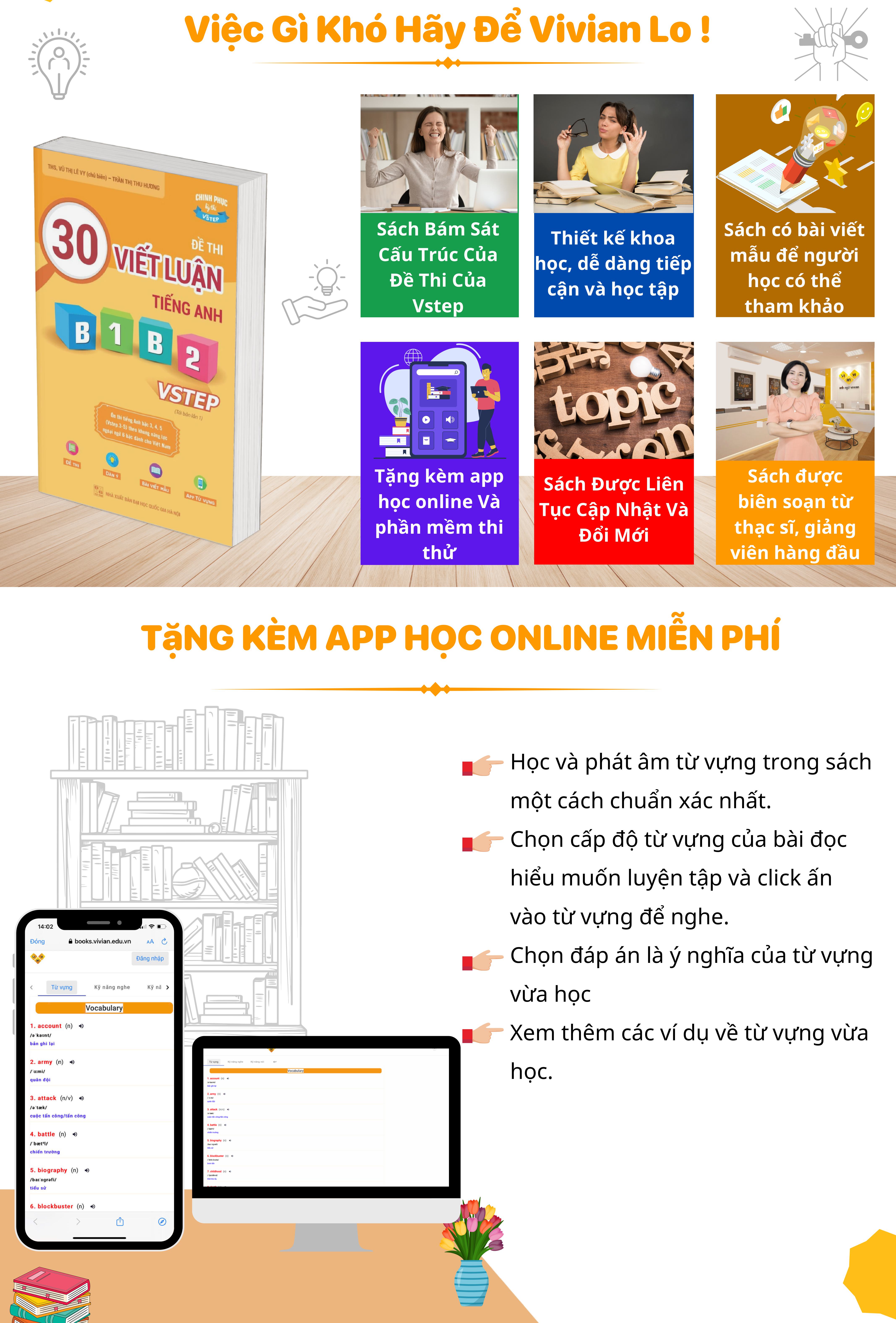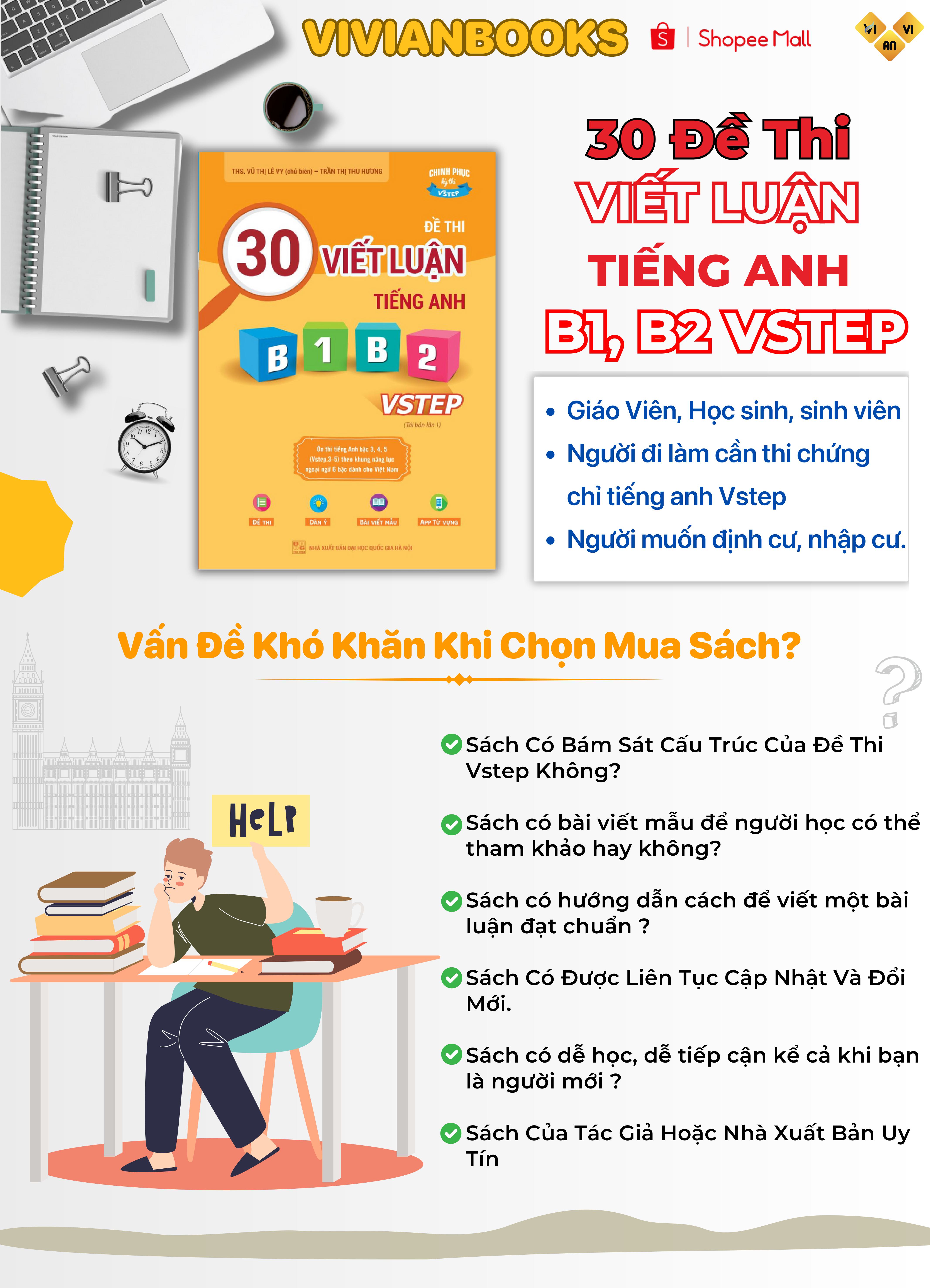 Để giúp bạn chuẩn bị tốt cho kỳ thi viết luận tiếng Anh Vstep và IELTS, đội ngũ Anh ngữ Vivian đã biên soạn và xuất bản thành công ấn phẩm “30 đề thi viết luận tiếng Anh B1, B2 Vstep” tại NXB Đại học Quốc Gia Hà Nội. Sách 30 đề thi viết luận tiếng Anh B1, B2 Vstep tổng hợp những bài viết luận gần đây của các đơn vị tổ chức. Sách gồm 30 đề thi viết luận thuộc 4 dạng bài thi viết luận thường gặp trong kỳ thi Vstep.